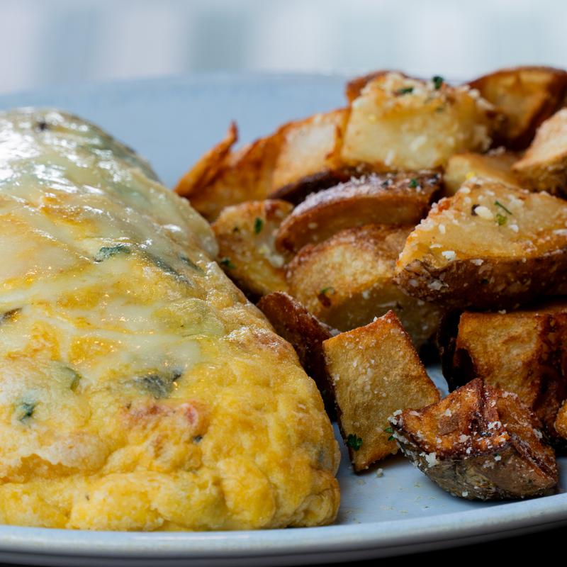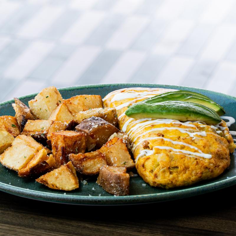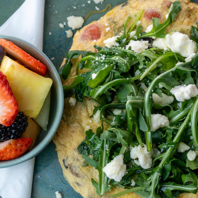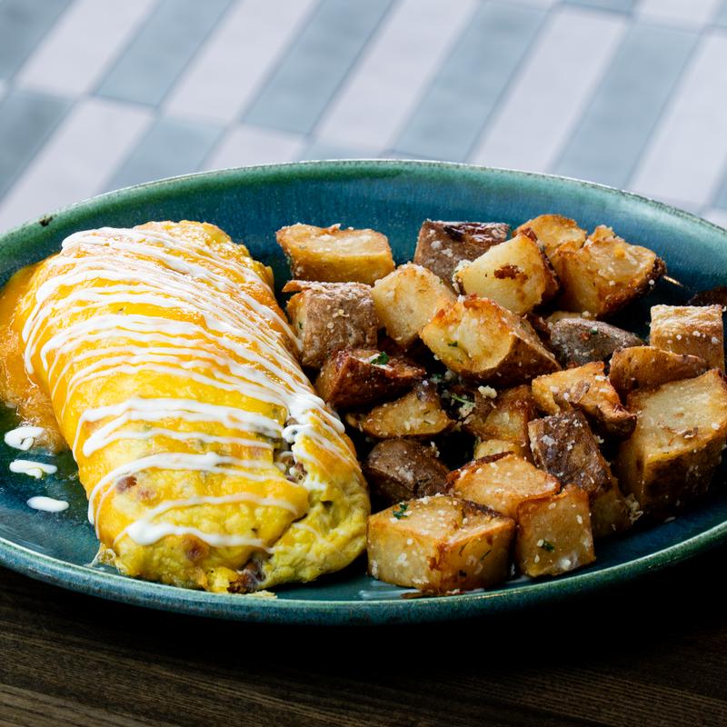 Omelet or skillet, can be either, made with cage-free eggs, served with a choice of Cowboy Potatoes or Mixed Greens, and a choice of Toast or Pancakes | Substitute Fruit +$2.00 | Substitute Egg Whites at no additional charge.